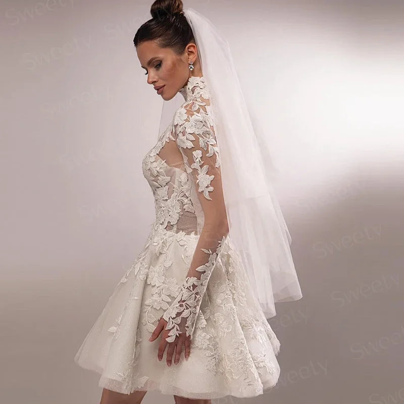 Crafted with exquisite organza and delicate embroidery lace, the Giana Mini Dress exudes elegance and sophistication. Designed as a high-neck wedding dress, this cocktail-length ball gown boasts full sleeves, creating a stunning silhouette. Perfect for prom or any special occasion, this dress is guaranteed to make you feel like a princess.