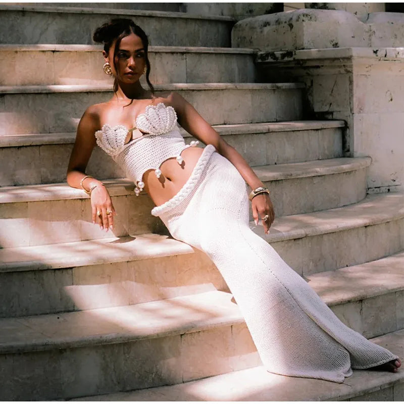 Elevate your summer wardrobe with the Janiya Two Piece Set. This unique set features a crochet knitted pearl bra with a backless design, paired with a stylish hollow out short top and twists long skirt. Perfect for a beach holiday, this set will make you feel confident and chic all season long.