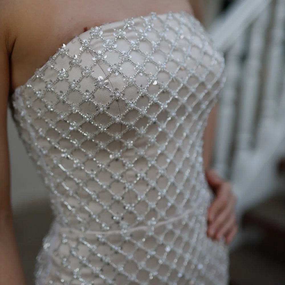 Custom sizing ensures a perfect fit by tailoring the dress to your unique measurements, eliminating the need for major alterations. This aligns with our values of intentionality, sustainability, and unparalleled craftsmanship. By focusing on made-to-order designs, we reduce waste and create a truly personalized experience for each bride.